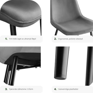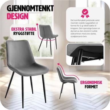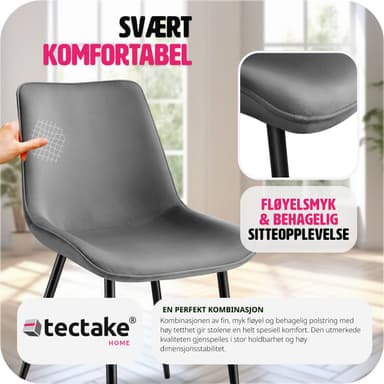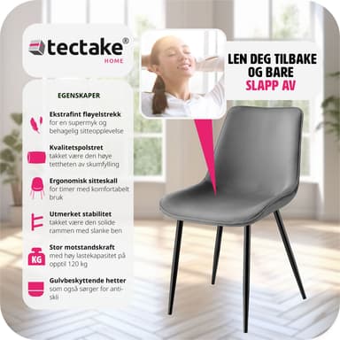 Tyylikkäät sametinäköiset ruokailutuolit Tectakelta tarjoavat vaikuttavan muotoilun, joka sopii mihin tahansa kotiin. Nämä tuolit on ergonomisesti muotoiltu mukavilla istuintyynyillä, jotka tekevät istumisesta erittäin miellyttävää. Niiden ajaton muotoilu varmistaa, että ne sopivat hyvin muihin sisustustyyleihin. Lisäksi tuoleissa on lattiaa suojaavat muoviset korkit, jotka ovat hellävaraisia lattiallesi. Nämä ruokailutuolit ovat erittäin vakaita ja kestäviä, mikä tekee niistä täydellisiä jokapäiväiseen käyttöön. Hanki upeat samettituolit Tectakelta keittiöösi tai olohuoneeseesi jo tänään.