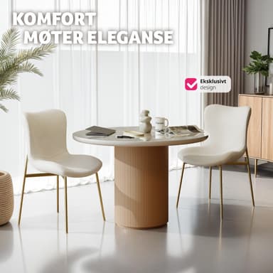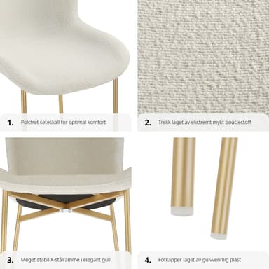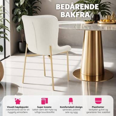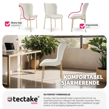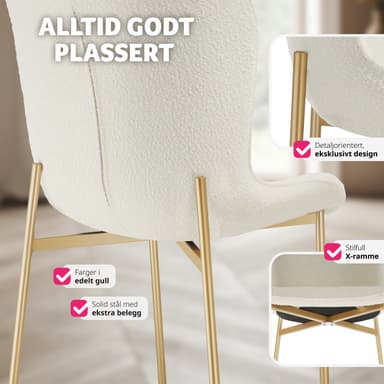 Heidän pehmeä Bouclé-kankaansa elegantissa beigessä ja antelias istuinalue paksulla vaahtomuovipehmusteella tarjoavat nämä tuolit ensiluokkaista istumamukavuutta. Korkea selkänoja tarjoaa lisätukea ja kutsuu rentoutumaan. Hoikat teräsjalat tyylikkäässä kultaisessa sävyssä sopivat ihanteellisesti valkoisen Bouclé-kankaan kanssa ja antavat huoneellesi ripauksen eleganssia.