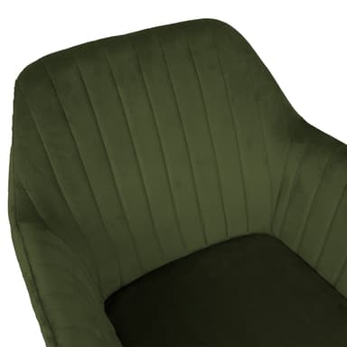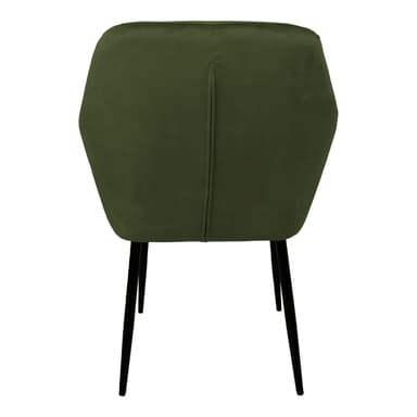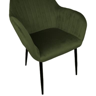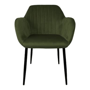 Tuoli EVELIN metsänvihreä sametti. Mukava istuin on kevyesti pehmustettu ja kokonaan peitetty ruskeanharmaalla samettikankaalla. Päällysmateriaali: 100% polyesteri. Istuinrunko: metallia ja vaneria. Verhoilu: polyuretaanivaahto. Mustaksi pulverimaalatut metallijalat. Tuolin kokonaismitat ovat 58x59xH81cm. Istuinleveys 37 cm, istuinsyvyys 39 cm, istuinkorkeus 46 cm. Käsinojan korkeus maasta on 65 cm. Painorajoitus 120kg.