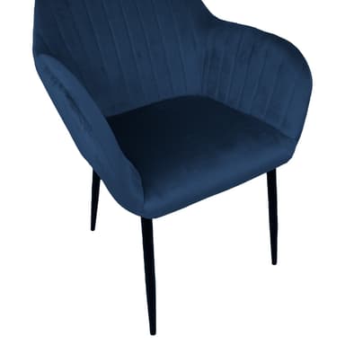 Tuoli EVELIN tummansinistä samettia. Mukava istuin on kevyesti pehmustettu ja kokonaan peitetty ruskeanharmaalla samettikankaalla. Päällysmateriaali: 100% polyesteri. Istuinrunko: metallia ja vaneria. Verhoilu: polyuretaanivaahto. Mustaksi pulverimaalatut metallijalat. Tuolin kokonaismitat ovat 58x59xH81cm. Istuinleveys 37 cm, istuinsyvyys 39 cm, istuinkorkeus 46 cm. Käsinojan korkeus maasta on 65 cm. Painorajoitus 120kg.
