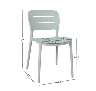 Tuoli MANGO vihertävänharmaata muovia. Tuoli sopii sekä sisä- että ulkokäyttöön, kotona, kahvilassa tai toimistossa. Tuolin kokonaismitat ovat 42,5x53,5xK79cm. Istuimen leveys 42cm, istuimen syvyys 42cm, istuimen korkeus 45,5cm. Painoraja 100kg. Materiaali: Polypropeeni (PP). Polypropeeni on kevyt ja erittäin kestävä materiaali, joka sietää hyvin kosteutta ja UV-säteilyä. Polypropeeni on kierrätettävää, mikä tekee siitä ympäristöystävällisen valinnan. HOITO Polypropeenista valmistettuja kalusteita on helppo huoltaa – pyyhi ne vain kostealla liinalla. SÄILYTYS Yleisesti ottaen polypropeenista valmistetut puutarhakalusteet ovat riittävän kestäviä kestämään normaaleja talviolosuhteita, mutta suosittelemme silti muovikalusteiden säilyttämistä sisätiloissa, jos mahdollista. Jos kalusteiden vieminen sisälle ei ole mahdollista, peitä ne säänkestävällä peitteellä suojataksesi niitä lumelta, jäältä ja kosteudelta. Vältä raskaiden esineiden asettamista kalusteiden päälle, sillä kylmyys voi haurastuttaa materiaalia ja paino voi vahingoittaa niitä.