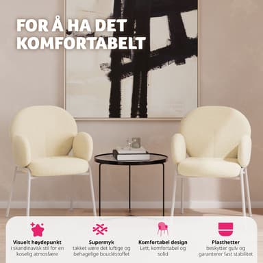 Sukella pohjoismaisen muotoilun ja elämäntavan maailmaan tyylikkään Scandi-nojatuolin kanssa tectake:lta, joka on täydellinen yhdistelmä tyyliä ja mukavuutta. Pehmeä Bouclé-kangas ja erittäin paksu pehmuste antavat tilavan istuimen, selkä- ja käsinojat, jotka tekevät tästä lepotuolista täydellisen pitkille lukuhetkille tai kohokohdaksi ruokapöydän ääressä. Vakaat, pyöreät metallijalat jalkakapeilla lattiaa suojaavasta muovista takaavat korkean kantavuuden ja ehdottoman vakauden. Hillityllä, mutta tyylikkäällä muotoilullaan helppohoitoisena Scandi-nojatuoli sulautuu saumattomasti mihin tahansa sisustustyyliin ja luo hygge-tunnelmaa – hetkiä puhtaasta tyytyväisyydestä.