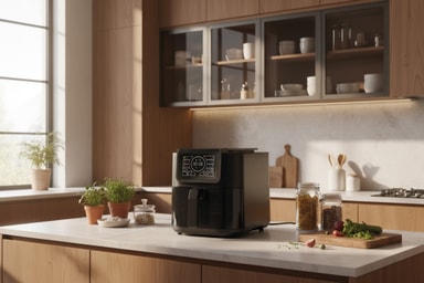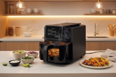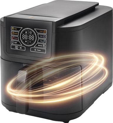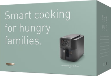 F&B Slim Smart -kiertoilmakypsennin tarjoaa 8 l tilavuuden, älykkään NTC-lämpötilansäädön sekä 6 digitaalista esiasetusta vaivattomaan ruoanlaittoon. Ohut muotoilu sopii pitkille ruoille, kuumenee jopa 200 °C, korissa on lapsilukko ja tarjotin on tarttumaton helppoa, rapeaa ja kätevää kypsennystä varten.