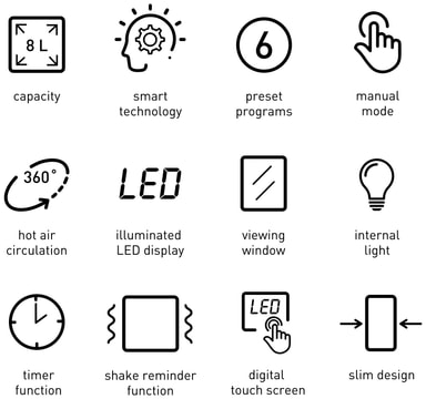 Digitaalinen ITO-kosketusnäyttö tarjoaa kuusi esiasetettua kypsennysohjelmaa yleisille ruoille, joten käyttö on helppoa ja intuitiivista. Aikaa ja lämpötilaa voi säätää myös manuaalisesti.