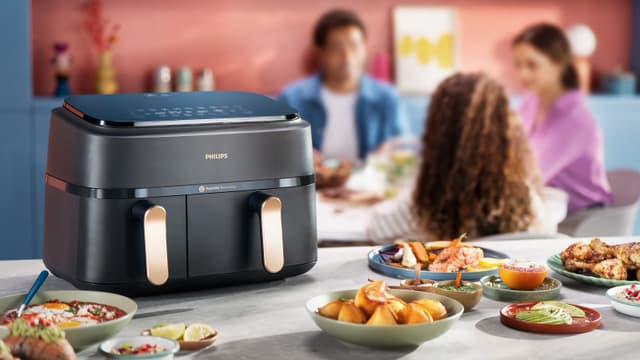 Koe Dual Basket Airfryerin monipuolisuus. Iso laatikko sopii pääruoille, ranskalaisille ja lempi airfryer aterioillesi, kun taas pienempi laatikko sopii täydellisesti lisukkeille, vihanneksille ja välipaloille. Kahden laatikon lisäksi siinä on Rapid Air -tekniikka, synkronointi- sekä kopiointitoiminto!