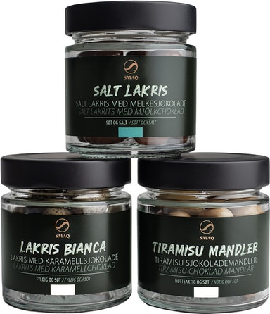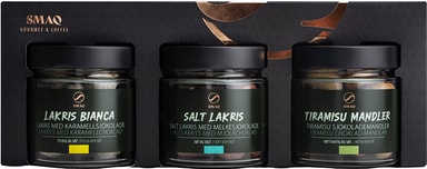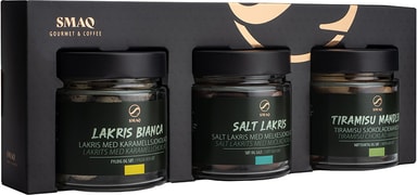Smaq Lakris Bianca -suklaalahjarasia sisältää: karamellisuklaalakritsihelmiä, suolaista lakritsia suklaalla ja tiramisu-kuorrutettuja manteleita. Makuisa lahja asiakkaille, kollegoille tai juhliin.Tutustu ominaisuuksiin