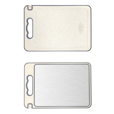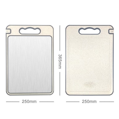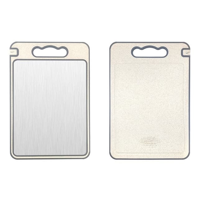 Kaksipuolinen muotoilu: Tässä leikkuulaudassa on kaksipuolinen muotoilu, joka tarjoaa monipuolisuutta ja mukavuutta. Toinen puoli on valmistettu 304 ruostumattomasta teräksestä, mikä tarjoaa hygieenisen ja helposti puhdistettavan pinnan. Toinen puoli on valmistettu elintarvikelaatuisesta PP:stä ja vehnän oljesta, mikä tarjoaa anteeksiantavamman pinnan herkille ainesosille. Tämän kaksoistoiminnon avulla voit vaihtaa pintojen välillä tarpeidesi mukaan, estää ristikontaminaatiota ja pidentää laudan käyttöikää. Käytä ruostumattomasta teräksestä valmistettua puolta raa'alle lihalle ja PP/vehnän olki -puolta hedelmille ja vihanneksille. Tämä tekee siitä erittäin joustavan ja käytännöllisen keittiövälineen.