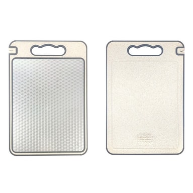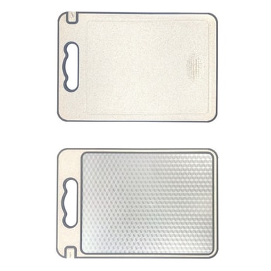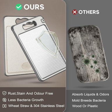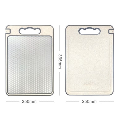 Kaksipuolinen muotoilu: Tässä leikkuulaudassa on kaksipuolinen muotoilu, joka tarjoaa monipuolisuutta erilaisiin ruoanvalmistustarpeisiin. Toinen puoli on valmistettu 304 ruostumattomasta teräksestä, mikä tarjoaa hygieenisen ja helposti puhdistettavan pinnan. Toinen puoli on valmistettu elintarvikelaatuisesta PP-vehnän oljesta, joka tarjoaa perinteisemmän leikkuupinnan. Tämän yhdistelmän avulla voit erottaa raa'at ja kypsennetyt ruoat, estää ristisaastumisen ja varmistaa optimaalisen elintarviketurvallisuuden. PP-vehnän olkipuoli on myös hellävarainen veitsille, mikä auttaa säilyttämään niiden terävyyden. Tämä muotoilu tekee siitä käytännöllisen ja tehokkaan lisäyksen mihin tahansa keittiöön.
