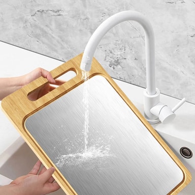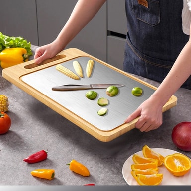 Hygieeninen leikkuupinta: Bambun ja ruostumattoman teräksen yhdistelmä tarjoaa luonnostaan hygieenisen leikkuupinnan. Bambulla on luontaisia antimikrobisia ominaisuuksia, jotka estävät bakteerien kasvua, kun taas ruostumaton teräs on helppo puhdistaa ja desinfioida. Tämä varmistaa turvallisen ja puhtaan ruoanvalmistusympäristön, vähentää ristikontaminaation riskiä ja edistää parempaa hygieniaa keittiössäsi. Sileä pinta estää myös ruoan hiukkasten tarttumisen, mikä tekee puhdistamisesta vaivatonta ja nopeaa. Ihanteellinen lihan, vihannesten, hedelmien ja juustojen valmistukseen.