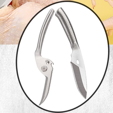 Hållbart rostfritt stål: Tillverkade av högkvalitativt rostfritt stål, erbjuder dessa saxar exceptionell styrka och korrosionsbeständighet. Den robusta konstruktionen säkerställer långvarig prestanda, även vid frekvent användning. Det rostfria stålmaterialet är lätt att rengöra och underhålla, vilket förhindrar uppbyggnad av bakterier och säkerställer hygien i köket. De vassa bladen skär enkelt igenom tuffa material och ger pålitlig och effektiv skärkraft i många år framöver. Materialet säkerställer att saxen förblir rostfri och bibehåller sin skärpa över tid.