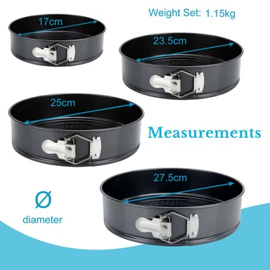 Yksittäisten muottien halkaisijat ovat: 28, 26 , 24, 18 cm. Muotit on helppo puhdistaa käsinpesulla.