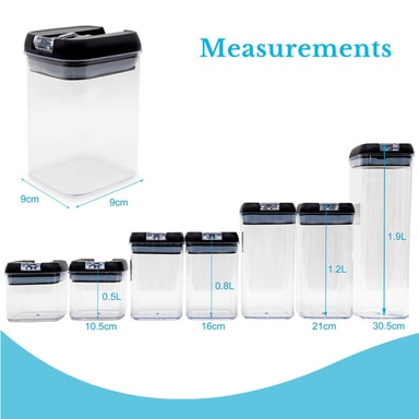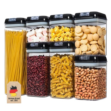 Pidä ruokasi tuoreena ja kuivana, olipa kyse sitten leivonnaisista, pastasta, muroista, pähkinöistä, makeisista, leivonnaisista, kuten jauhoista, tai jopa nesteistä. Käytännöllisiä laatikoita voi säilyttää ruokakomerossa, keittiössä ja myös hotellin välipalabaarissa. Ne näyttävät hyviltä. Astiat ovat suorakaiteen muotoisia ja siksi pinottavia, mikä tekee niistä tilaa säästäviä. Niissä on myös korkki, joka tekee kannesta vesitiiviin ja ilmatiiviin. Säilytyslaatikot ovat 7-osainen setti eri tilavuuksilla.Vaihdettavat etiketit etiketöintiä varten välttävät sisällön sekoittumisongelmia. Ne ovat helposti pestäviä, konepesun kestäviä, kestäviä ja BPA-vapaita.