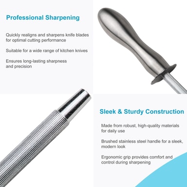 LAATU: Sekä ruostumattomasta teräksestä valmistettu varsi että kahva on valmistettu korkealaatuisesta teräksestä. Ergonominen kahva istuu hyvin käteen, jotta teroitin ei luiskahda kädestäsi teroituksen aikana.