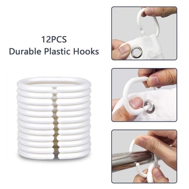 【Helppo asennus】Sisältää 12 muovikoukkua verhoille nopeaa ja vaivatonta asennusta varten kylpyhuoneeseen.