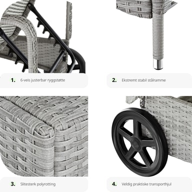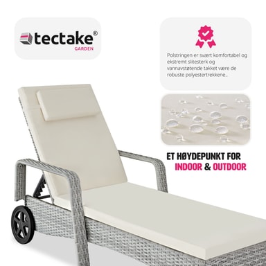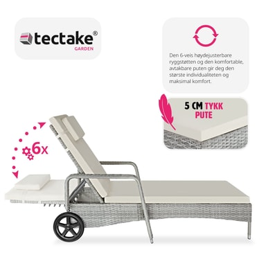 Rentoudu puutarhassa tai terassilla tämän tectaken aurinkotuolin avulla. Tyylikäs lepotuoli voi olla ehdoton katseenvangitsija parvekkeellesi, saunaan tai kylpytilaan. Hienostunut muotoilu tyylikkäine muotoineen ja innovatiivinen materiaaliyhdistelmä tekevät tästä aurinkotuolista myös visuaalisesti täydellisen. Aurinkotuolin selkänoja on säädettävissä tarpeidesi mukaan, ja kahden pyörän ansiosta sitä on helppo kuljettaa ja asettaa uudelleen. Tuolien vakaa metallirunko ja helppohoitoinen polyrottinki soveltuvat optimaalisesti sekä ulko- että sisäkäyttöön kotonasi. Hieno lisä tässä kalusteessa on mukava, irrotettava pehmustettu istuinosa ja erilliset tyynylisävarusteet. Nauti kesästä puutarhassasi tämän tectaken aurinkotuolin avulla.