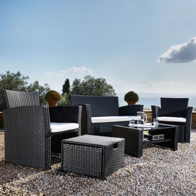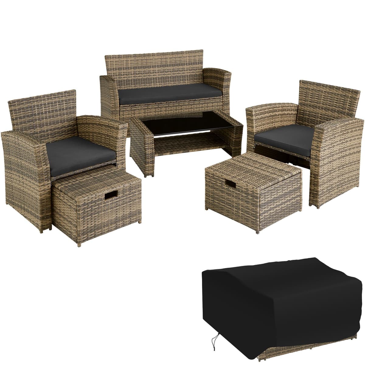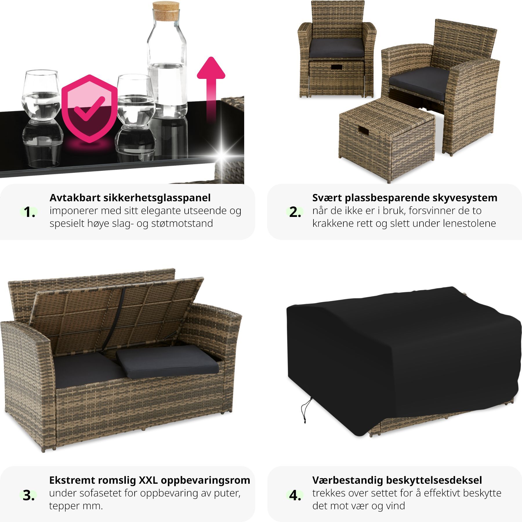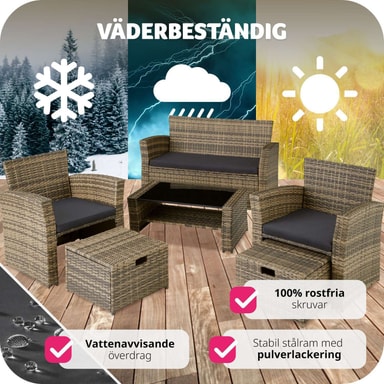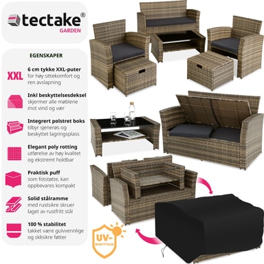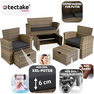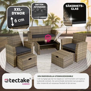 Tässä tectaken kutsuvassa rottinkipuutarhakalustesarjassa yhdistyvät tyylikäs muotoilu ja optimaalinen mukavuus. Pehmeät tyynyt ja jalkatukijakkarat lupaavat olohuoneen kaltaista rentoutumista ulkona. Kun jakkarat eivät ole käytössä, ne voidaan helposti liu'uttaa tuolien alle säilytystä varten, kun taas vettä hylkivät tyynyt voidaan säilyttää sohvan sisällä. Kotiterassisarjassa on pieni pöytä, joka sopii erinomaisesti välipalojen ja juomien säilyttämiseen, jotta voit nauttia rennosta ulkoruokailusta ystävien ja perheen kanssa. Pöydän lasikatto lisää tämän istuinsarjan tyylikästä muotoilua. Laadukkaan, kestävää polyrottinkia olevan punonnan ja vankan teräsjalustan ansiosta tämä tectaken helppohoitoinen rottinkipuutarhakalustesarja tekee varmasti vaikutuksen puutarhassasi.