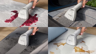 Laite sisältää useita lisävarusteita, jotka helpottavat puhdistusta: 90 cm 3-in-1-suutin, 150 cm leveä suutin ja Philips Stain Remover -pesuaine.