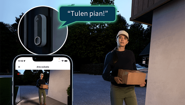 Varmista ulko-ovesi turvallisuus Arlon 4-in-1-video-ovikellon avulla. Asenna muutamassa minuutissa, ja saat videojärjestelmän, joka suoratoistaa live-värejä siitä, kuka tai mitä on etuovellasi. Valitse Arlo Secure -tilaus (myydään erikseen), jos haluat tallentaa videoleikkeitä pilveen ja katsoa niitä sovelluksen kautta. Kun ovikelloa painetaan, voit vastata videopuheluun ja puhua vierailijoille reaaliajassa kaksisuuntaisen äänen avulla. Lisäksi voit toimia välittömästi ja pelottaa tunkeutujat integroidulla tunkeutujahälyttimellä.