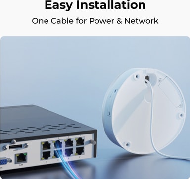 Kamera saa virtansa yhdellä Ethernet-kaapelilla, joten erillisiä virtalähteitä tai monimutkaista kaapelointia ei tarvita. Lisäksi keskitetty virranhallinta tuo mielenrauhaa: tiedät, että kamera on aina yhteydessä ja virroissa.