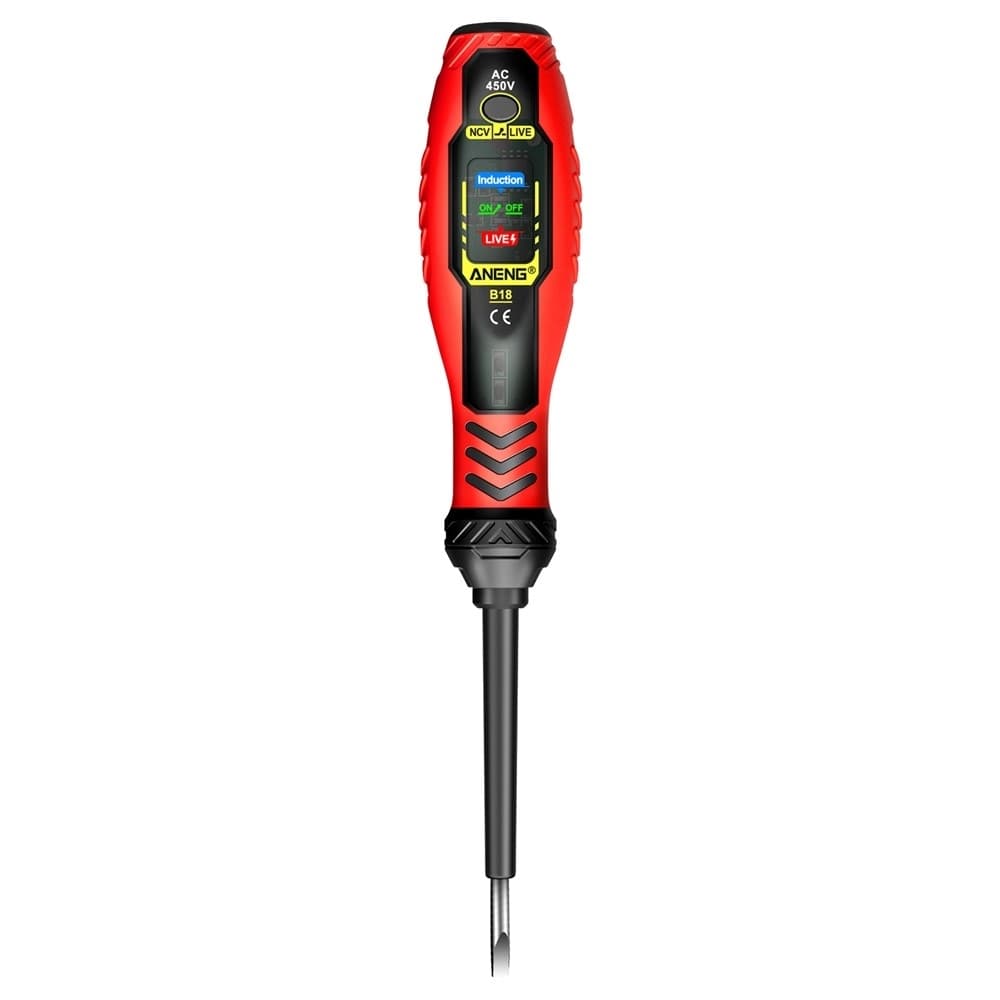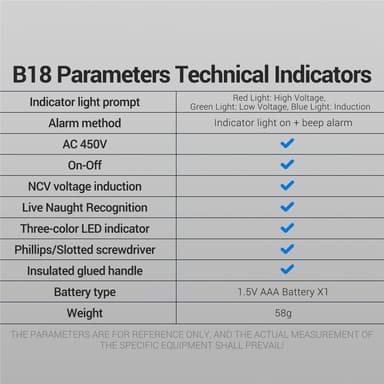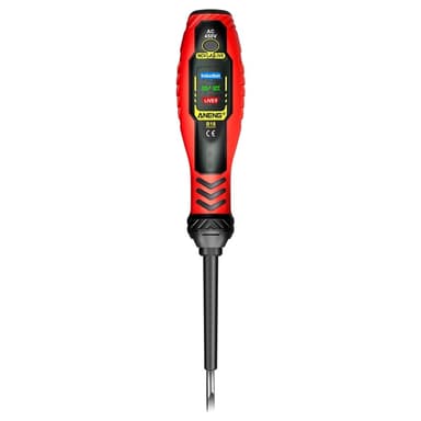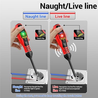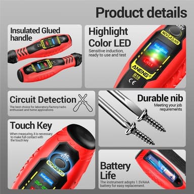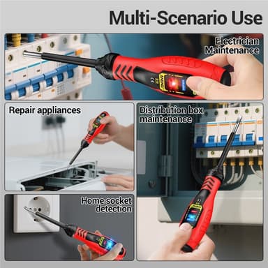 【Monitoiminen testaus】Voi havaita korkeajännitteen, tunnistaa vaihe-/nollajohtimet ja tunnistaa kosketuksettoman jännitteen (NCV) kattavaa sähkötestausta varten.【Kolmivärinen LED-merkkivalo】Punaiset, vihreät ja siniset LED-valot osoittavat jännitetasTutustu ominaisuuksiin