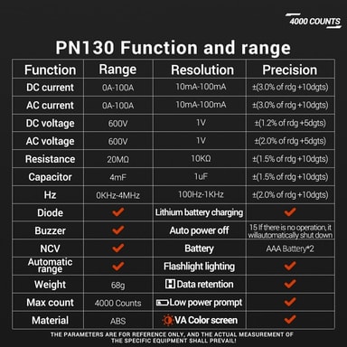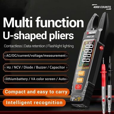 ANENG PN130 U-muotoinen digitaalinen yleismittari DC/AC jännitevirtavastuskondensaattorin testeri【U-muotoinen puristinrakenne】 Innovatiivinen U-muotoinen puristinpää mahdollistaa nopeat ja helpot mittaukset ilman puristinta avaamatta, mikä lisää tehoTutustu ominaisuuksiin