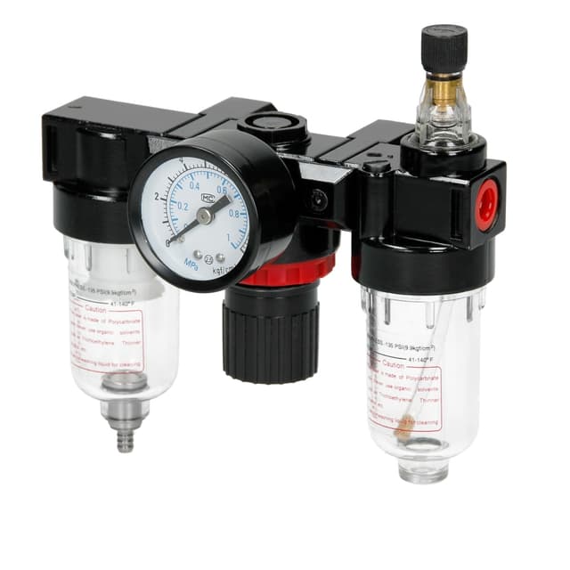 Toimituksen laajuus1 x vedenerotin, joka koostuu seuraavista osista:VedenerotinÖljypolttajaPaineenalenninPainemittariTekniset tiedotLiitäntä : 1/4''Mitat: 140 x 90 x 140 mmTyöväline: ilmaTestipaine: 1.5Mpa (213psi)Max.