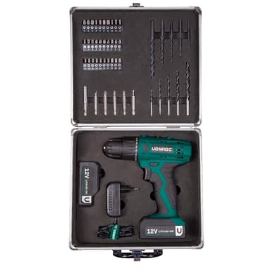 Diese VONROC 12-V-Akku-Bohrmaschine wird in einem stabilen Aluminiumkoffer geliefert, der alles bietet, was Sie zum Bohren und Schrauben brauchen. Dieses Komplettset enthält eine 12-V-Akku-Bohrmaschine, zwei 1,3 Ah Li-Ionen-Akkus, ein Schnellladegerät und 46 Zubehörteile!