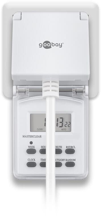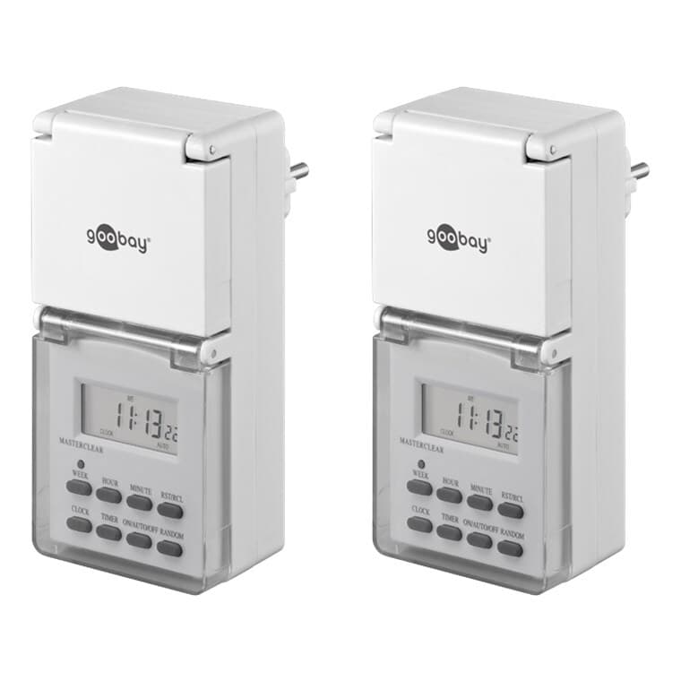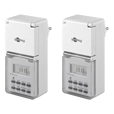 Digitaalinen ajastin ulkokäyttöön, valmistettu IP44-luokituksen mukaisesti elektronisten laitteiden tarkkaan ohjaukseen.