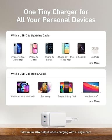 Anker 521 2xUSB-C Lauturi 40W on kompakti ja tehokas laturi, joka tarjoaa nopean ja luotettavan latauksen kaikille laitteillesi. Siinä on kaksi USB-C-porttia, jotka mahdollistavat sekä USB-C-kannettavan (jopa 40 W) että muiden laitteiden, kuten älypuhelimien ja tablettien, nopean lataamisen.Tekniset tiedot: