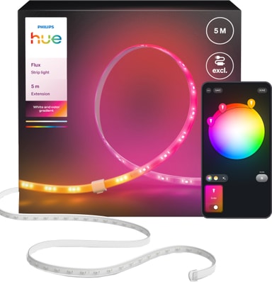 Philips Hue Flux -jatkopala on älyvalaistusratkaisu, joka tuo kotiisi eloisaa väriä ja mukautettavaa valaisua. Tämä 5 metrin jatkopala liitetään olemassa olevaan Philips Hue -järjestelmääsi, joten laajennat valaistuskokonaisuutta vaivattomasti. Ohjaa Hue Flux -nauhaa Philips Hue -sovelluksella tai Alexa-äänikomennoilla, jolloin saat tarpeisiisi räätälöidyn valaistuskokemuksen.