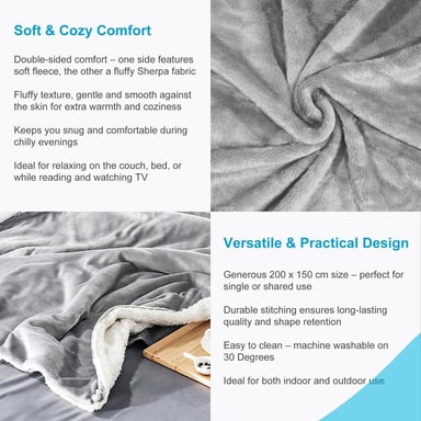 Pehmeä samettinen pehmopeitto. Valmistettu flanellifleecestä ja sherpafleecestä. 200 x 150 cm.Tutustu ominaisuuksiin