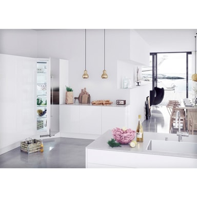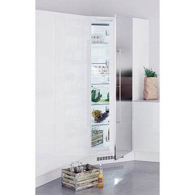 Hyödynnä tila optimaalisesti: Kulmajääkaappi hyödyntää keittiösi tilan optimaalisesti eikä vie kulmaan sijoitettuna liikaa tilaa. Tämän integroitavan mallin mukana tulee tyylikäs ruostumattomasta teräksestä valmistettu ovi. Sivupaneelit ja sokkeli myydään erikseen.