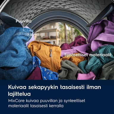 MixCare tarjoaa tehokkaan mutta hellävaraisen kuivauksen sekapyykille, ja varmistaa, että vaatteet kuivuvat tasaisesti ilman lajittelua.