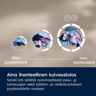 - SensiCare säätää kuivausajan ja energiankulutuksen täyttömäärän mukaan.