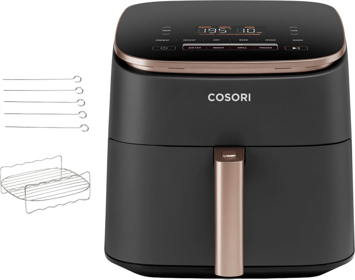 1725 W Cosori Turbo Blaze -kiertoilmakypsentimessä on 6 litran paistokori sekä 9 esiasetettua toimintoa, joiden avulla voit paistaa, paahtaa, lämmittää, grillata ja paljon muuta. Tarttumattomat, konepestävät osat takaavat vaivattoman puhdistuksen.Tutustu ominaisuuksiin