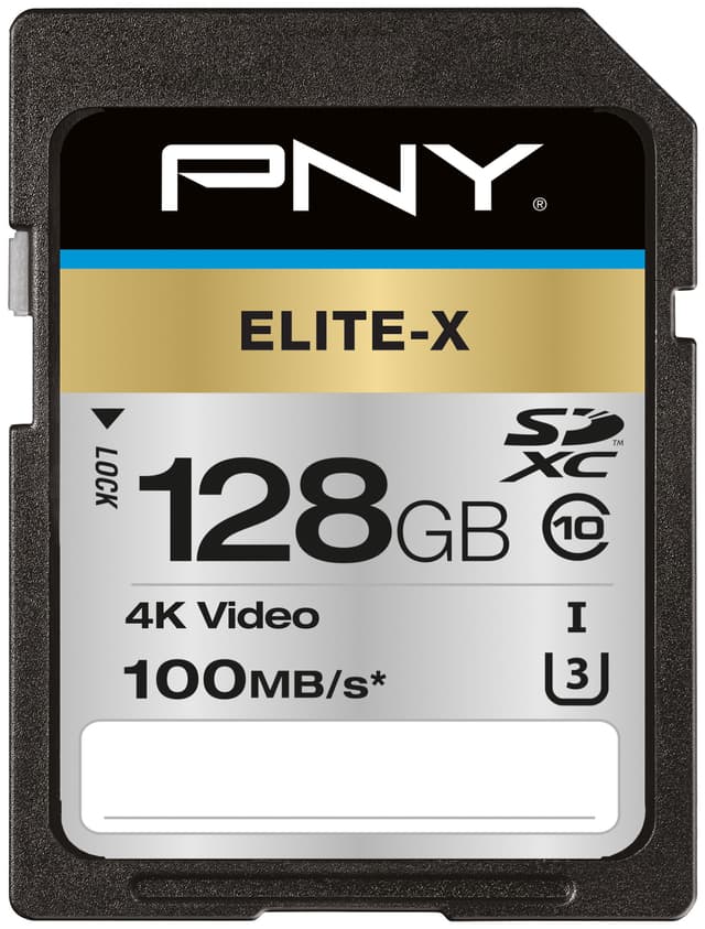 PNY Elite-X SDXC -muistikortille tallennat järjestelmä- tai videokameralla kuvatut nopeat valokuvasarjat ja 4K UHD -videot. Kortilla on 128 GB tallennustilaa, jatkuva U3-kirjoitusnopeusluokitus ja korkea lukunopeus.
