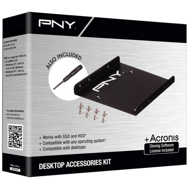 PNY-päivityspakkauksen avulla voit lisätä pöytätietokoneeseesi nopeamman SSD-muistin ja siirtää kaikki vanhan kiintolevyn tiedostot. Pakkaus sisältää 3,5/2,5 tuuman kiinnikkeen, ruuvit ja ruuvimeisselin ja SATA 3 -datakaapelin. Lisäksi saat lisenssin Acronis TrueImage HD -ohjelmistolle, jonka avulla kopioit kiintolevyn sisällön SSD-levylle turvallisesti.
