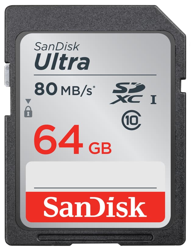SanDisk Ultra SD 64 GB muistikortilla tallennat kamerasi kuvia ja Full HD-videoita 80 MB/s nopeudella.Tutustu ominaisuuksiin