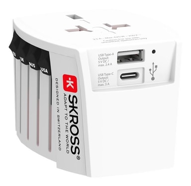 SKross MUV World USB-A/USB-C -matka-adapteri on kätevä 2-napainen matka-adapteri ja -laturi, josta on apua matkoillasi. Voit ladata jopa kahta laitetta samanaikaisesti USB-C- ja USB-A-porttien kautta, samalla kun olet kytkettynä yhteen 2-napaisesta laitteestasi. Tämä sovitin on käyttökelpoinen yli 220 matkakohteessa, joten säästät varmasti paljon vaivaa.