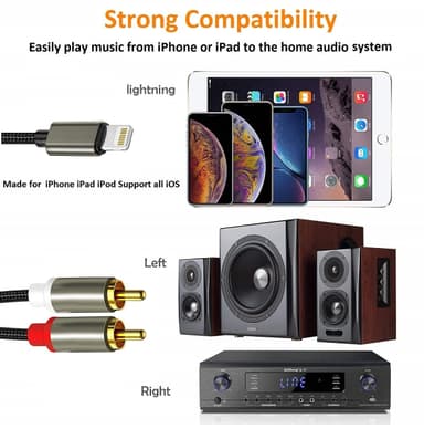 Tämä kaapeli muuntaa liitännän Lightningistä RCA-stereoksi ja antaa sinun liittää Lightning-laitteesi, kuten puhelimet, tabletit ja tietokoneet, vahvistimeen, kaiuttimiin ja A/V-vastaanottimeen. Huomaa, että kaapeli on vain äänelle, ei videolle. Yhteensopiva suuren valikoiman Lightning-portilla varustettujen laitteiden kanssa, eikä ajureita tarvita. Kullanväriset liittimet ja 2 metrin nylonpunottu kaapeli takaavat parhaan äänen ja kestävyyden.