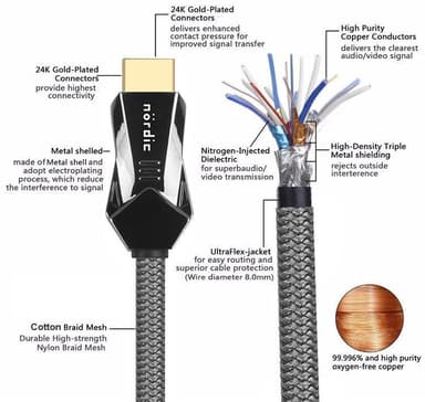 Tämä NÖRDIC Ultra High Speed HDMI -kaapeli on sertifioitu HDMI-organisaation Ultra High Speed HDMI -kaapelin sertifiointiohjelman mukaisesti, mikä tarkoittaa, että kaapeli täyttää kaikki ohjelmassa määritellyt tekniset vaatimukset, mukaan lukien resoluutio jopa 8K tuumaa. 60 Hz, 4K 120 Hz, kaistanleveys jopa 48 Gbps, tuki 100 Mbit/s Ethernetille, Dynamic HDR, tuki jopa 32 erilliselle äänikanavalle 48 KHz kullekin jne.