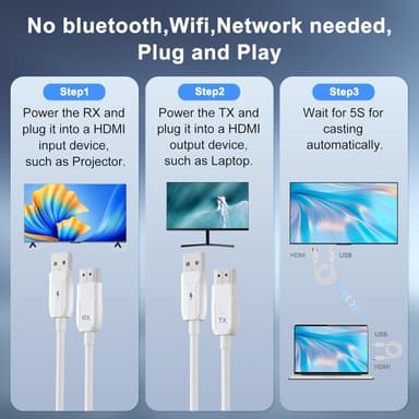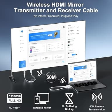 Tämä tuote on langaton HDMI-toistin, jossa on lähetin ja vastaanotin, jotka helpottavat näytön peilaamista tai laajentamista – ilman sovelluksia, Bluetoothia tai Wi-Fiä. Liitä laite plug-and-play -toiminnolla, pidä painiketta 5 sekuntia ja odota muutama sekunti yhteyden muodostumiseen. Täydellinen työskentelyyn, kotiteatteriin, pelaamiseen tai matkustamiseen.