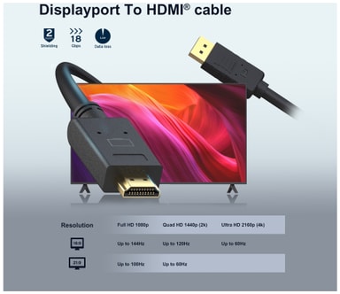 Logik DisplayPort–HDMI-kaapeli (1m) tukee resoluutioita ja virkistystaajuuksia aina 4K60Hz asti, tarjoten terävän ja sulavan kuvan. Nopea 18 Gbps siirtonopeus minimoi tiedonhävikin, ja kullatut liittimet parantavat yhteyden laatua. Tämä yksisuuntainen kaapeli välittää signaalin vain DisplayPortista HDMI:hin ja tukee sekä standardia että dual-mode DisplayPort-liitäntää.