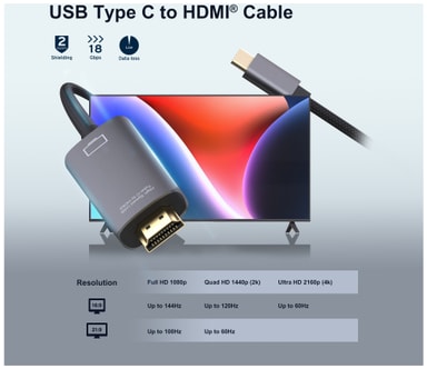 Sandstrøm USB-C–HDMI-kaapeli yhdistää vaivattomasti USB-C-laitteesi 4K UHD -televisioon kullattujen liittimien avulla. Siinä on kolminkertainen suojaus häiriöiltä ja se tukee jopa 18 Gbps kaistanleveyttä saumattomaan, nopeaan äänen ja kuvan siirtoon.Tutustu ominaisuuksiin