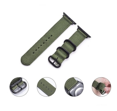Nato-ranneke Apple Watch Series 11 46mm: lle pikakiinnityksellä. Ranneke on valmistettu nailonista, mikä antaa sille tyylikkään ulkonäön ja miellyttävän tunteen.