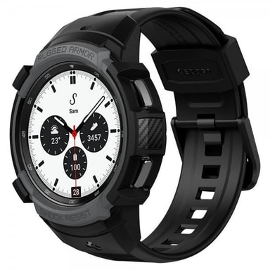 Rugged Armor Pro on ihanteellinen yhdistelmä tyyliä ja suojaa. Joustava kerros suojaa päivittäiseltä kulumiselta, joten sinun ei tarvitse murehtia naarmuja. Kuoressa on matta pinta, jota korostaa hiilikuituinen rakenne, joka tuo modernia tyyliä. Säädettävä ranneke on integroitu kiinni kuoreen.