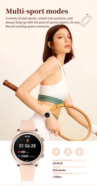 Elegantti ja toimiva: Älykellossa on tyylikäs ja moderni muotoilu sekä eloisa viimeistely, mikä tekee siitä täydellisen asusteen niin rentoon kuin juhlaankin. Sen kevyt ja mukava rakenne takaa, että voit käyttää sitä koko päivän ilman epämukavuutta.