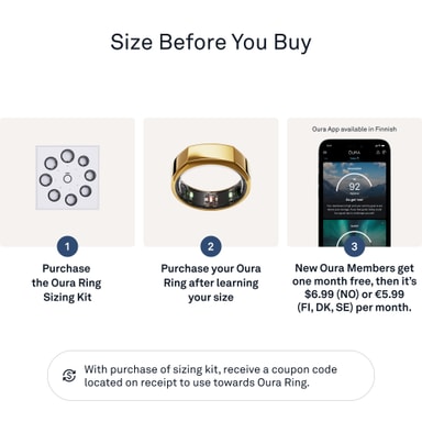Oura-sormuskoot poikkeavat tavanomaiseista standardeista, joten täydellisen istuvuuden löytäminen on ratkaisevan tärkeää optimaalisen käyttökokemuksen kannalta. Sovitussormussetin ansiosta voit löytää itsellesi täydellisen koon. Kun ostat sovitussetin, saat lahjakortin, jonka voit käyttää Oura-sormuksen ostamiseen.