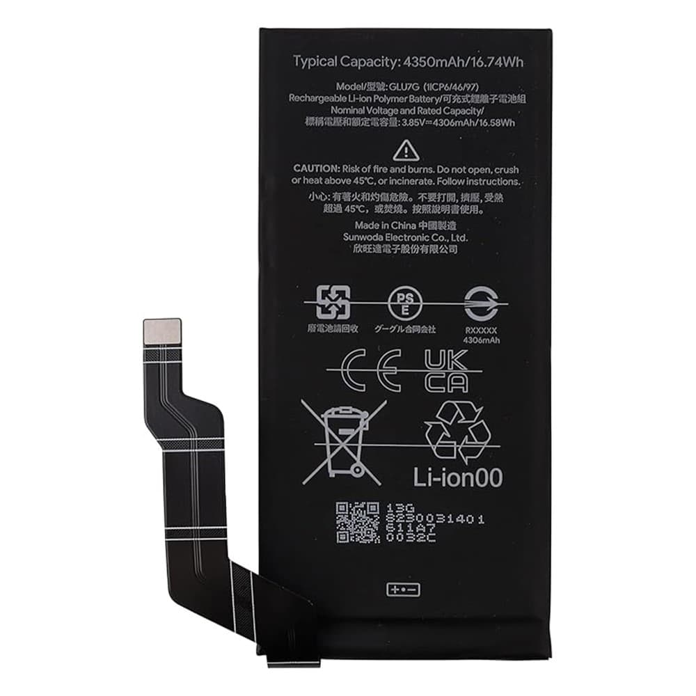 Google Pixel 6a:n akku, 3,85 V, 4306 mAh, litium-polymeeriakku. Yksikön koodi: GLU7G.