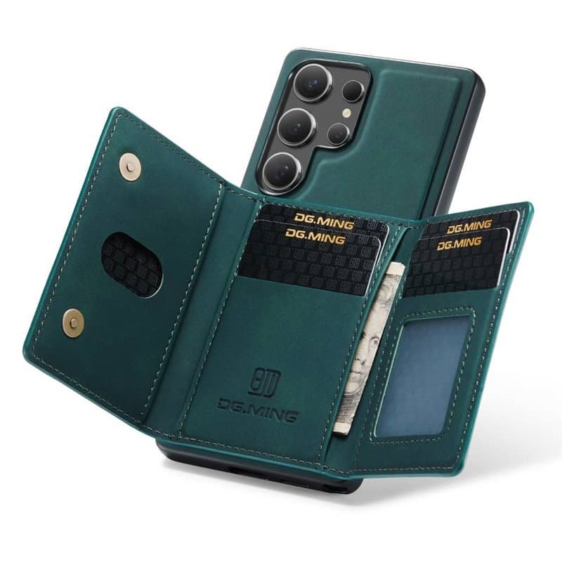 DG-Mingin matkapuhelimen kuori, yhteensopiva Samsung Galaxy S25 Ultra kanssa, varustettu irrotettavalla magneettisella lompakolla. Mobiilikuori sisältää integroidut magneetit, jotka pitävät lompakon paikallaan. Kätevää ja helppoa vastata puheluihin, tai jos haluat jättää lompakkokohdan kotiin ja käyttää vain puhelinta. Kotelo on varustettu käytännöllisillä korttitaskuilla.